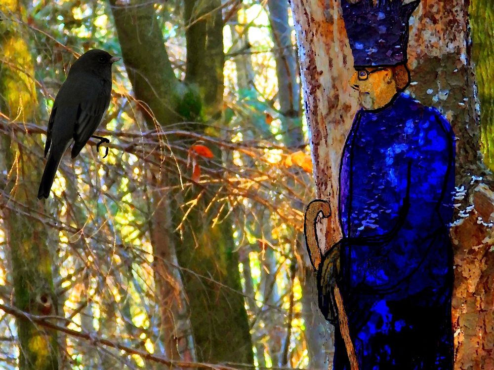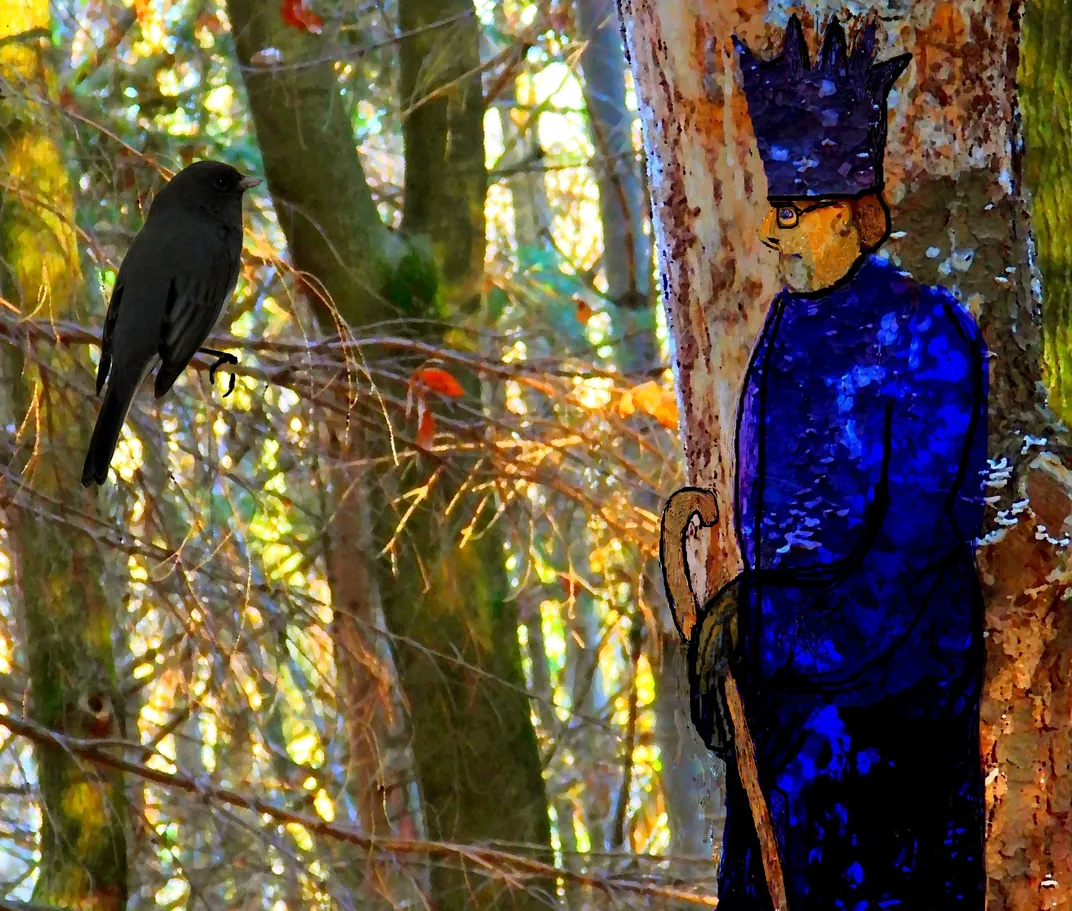 A dark eyed Junco told the crowned king,forest is where song birds go, for to rest in trees and sing. Tho' birds don't live like kings, they fly with angel wings! This is a composite of two pictures. I photographed the dark eyed junco that I saw in a corn field, the afternoon of October 18, 2024. The art work I created strictly from my imagination after seeing a faint design etched in the grain of a tree in the woods that reminded me of king's face wearing a crown which I shot a picture of on October 25, 2024. Then I embellished what I saw with a few extra touches that I added with the help of photo shop for the 'king' to wear a blue robe to match the crown and a walking stick in his gloved hand. The glasses were already there in the design. It was not an easy project which I found out after I got started, but it was satisfying to create.