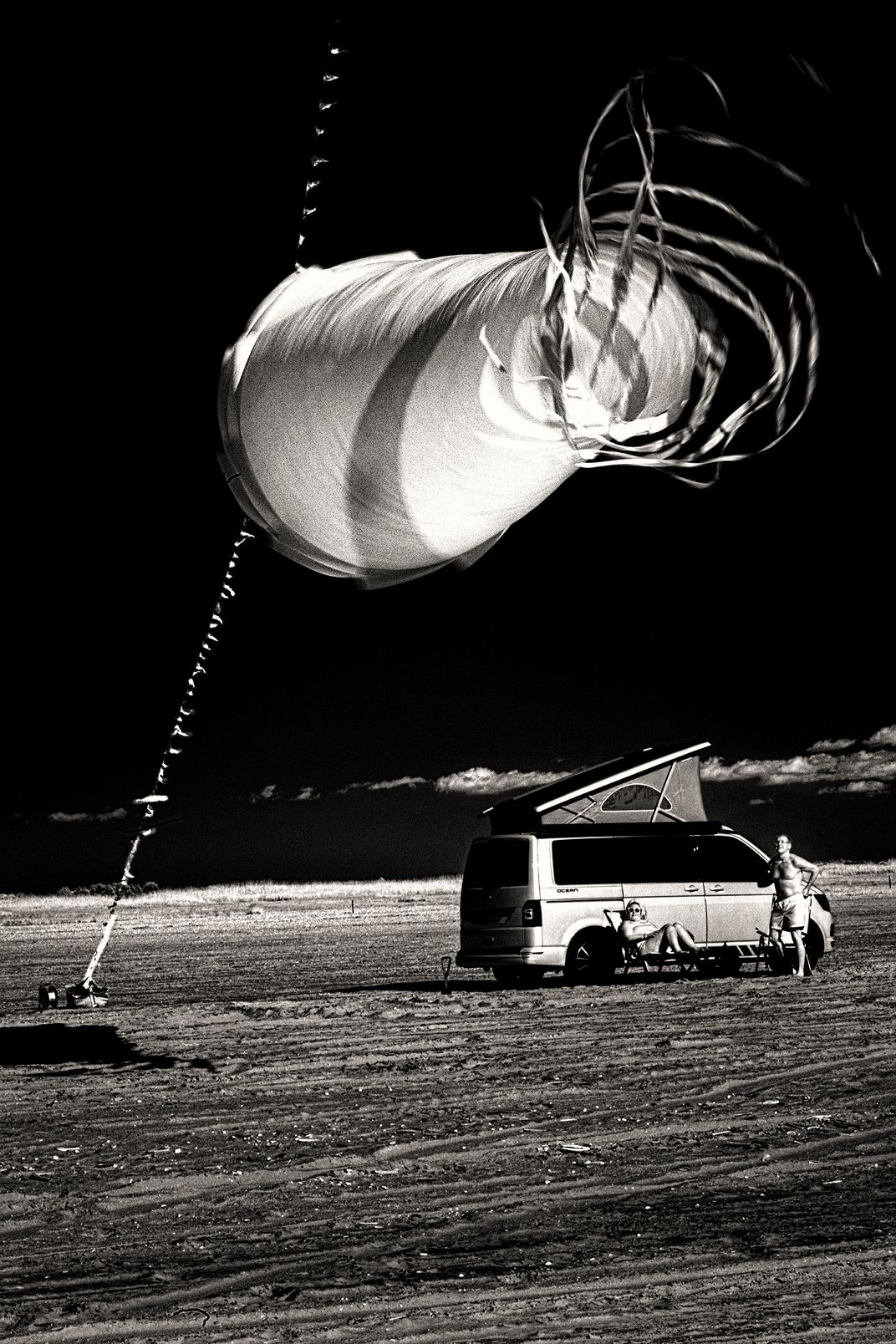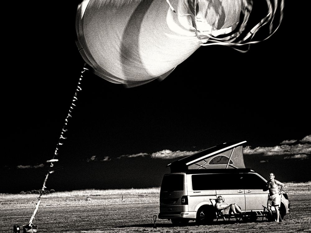 A giant revolving kite hanging from another kite on the beach in Rømø Denmark.