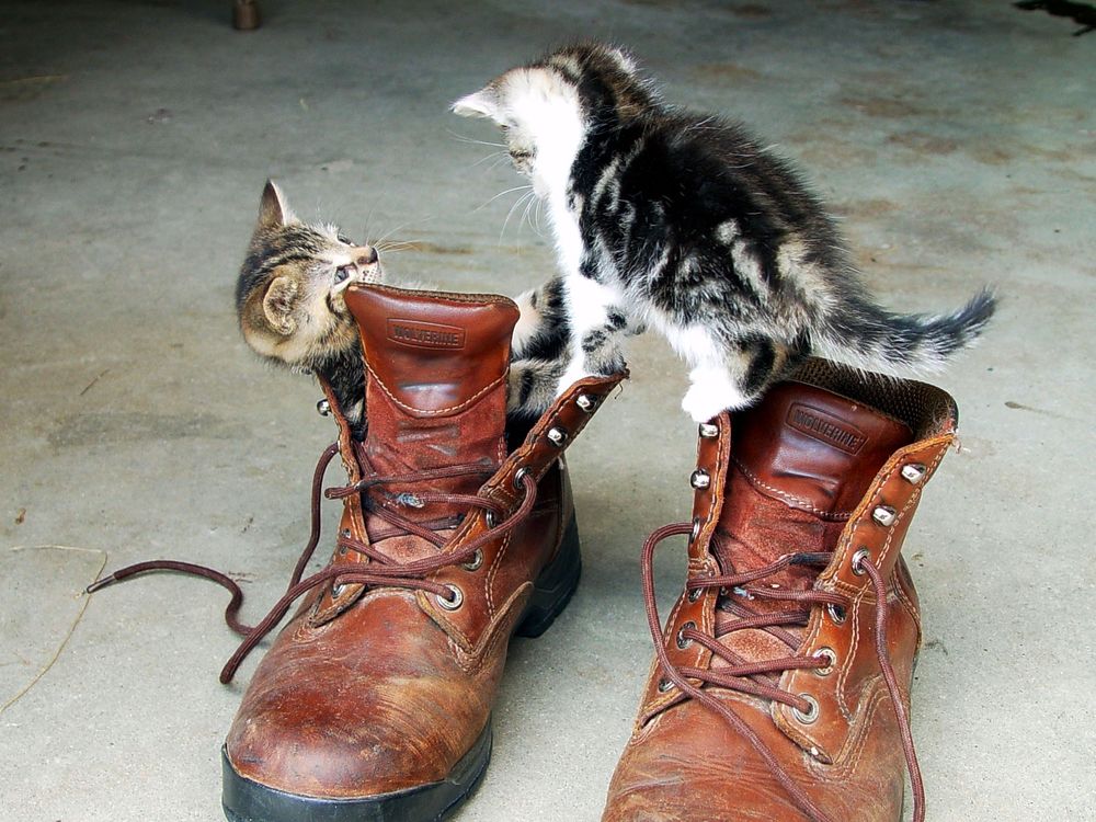 Kittens playing in my brother's work boots at our barn in upstate New York.