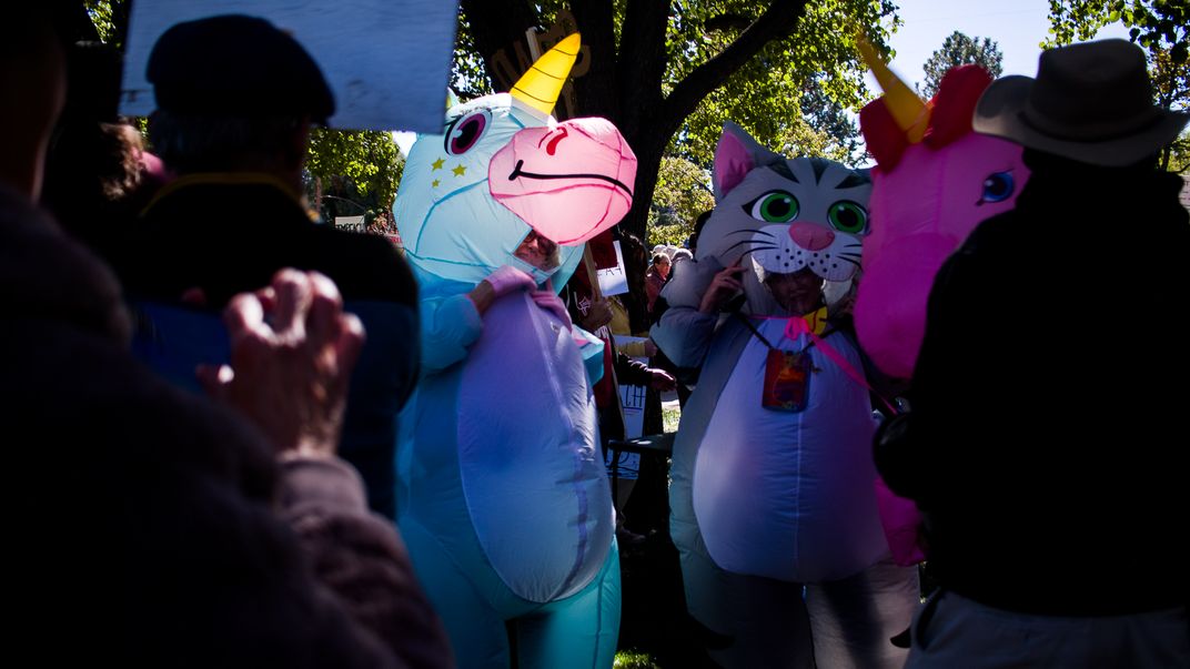 Patriotic protesters celebrate their love for their nation in inflatable unicorn and kitty costumes at the local No Kings 2.0 protest. Santa Fe, NM, 2025