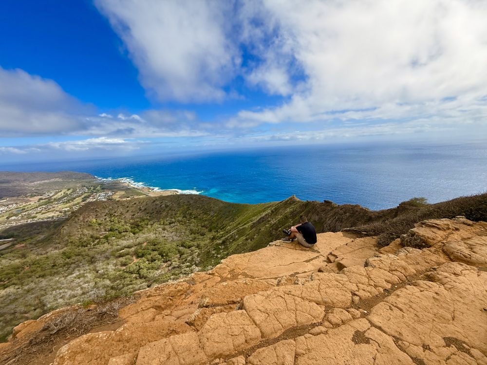 After hiking to the top of Koko Crater in Oahu, a view of the ocean appears in the distance.