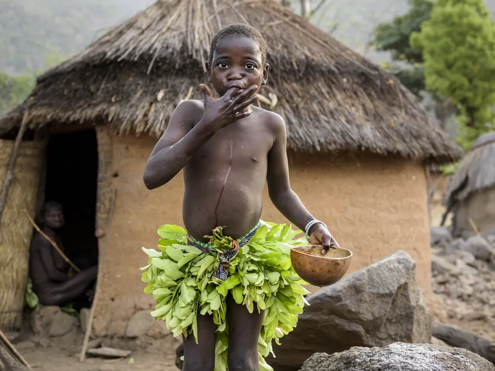 Girl from the Koma tribe, who live in the Atlantika mountains between Nigeria and Cameroon, washing her face early in the morning.