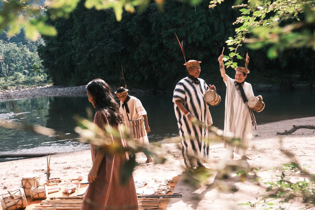 The photo shows Yanesha' elders after finishing one of their dances/chants (Koshamhñats), namely the Konareñets, the drum dance. They stand on the shore of the Palcazu river.
