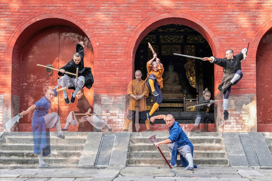 Four Shaolin monks were practicing traditional weapons in front of a Buddha temple.