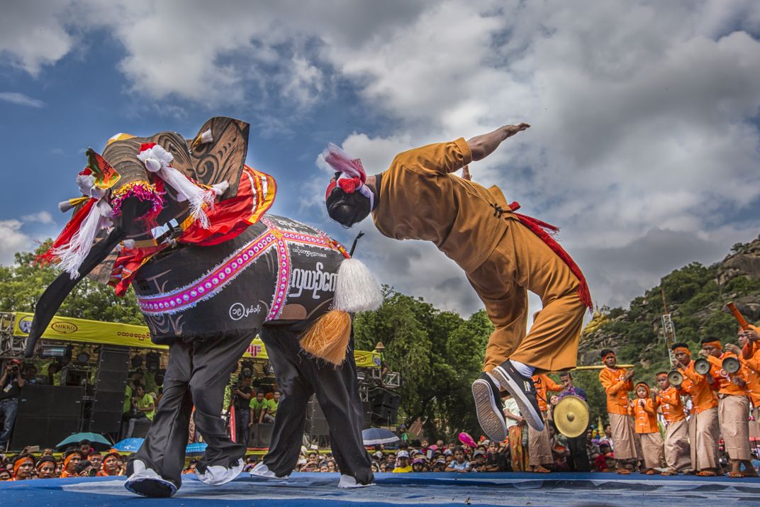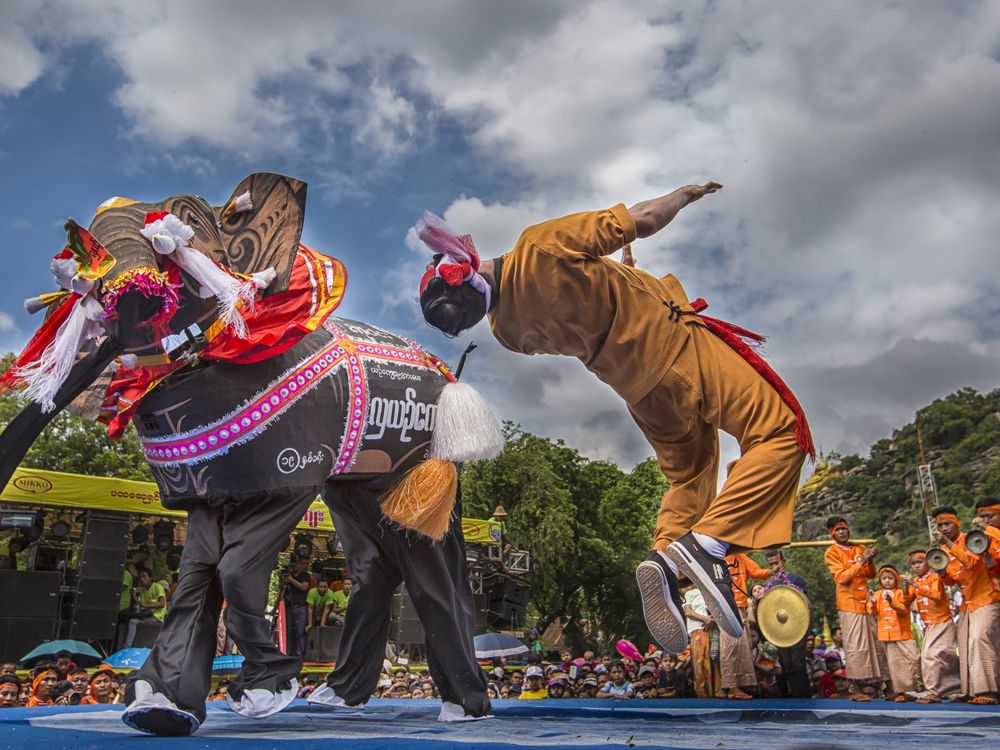 Kyaukse elephant dance festival is an annual major traditional dance festival in Myanmar.It's a marvellous performance of two men together to dance in rhythm. A huge Elephant figure is made from bamboo and paper. Men take their places inside the figure and dance around the town to the accompaniment of Dobat and Drums ( Myanmar traditional musical instruments ).