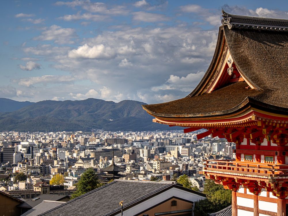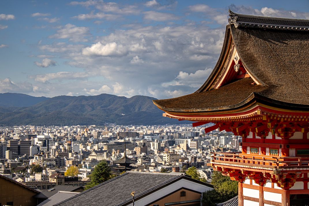 A sweeping view of Kyoto unfolds beneath the curve of a temple roof, bridging the quiet of tradition with the energy of the modern city below.