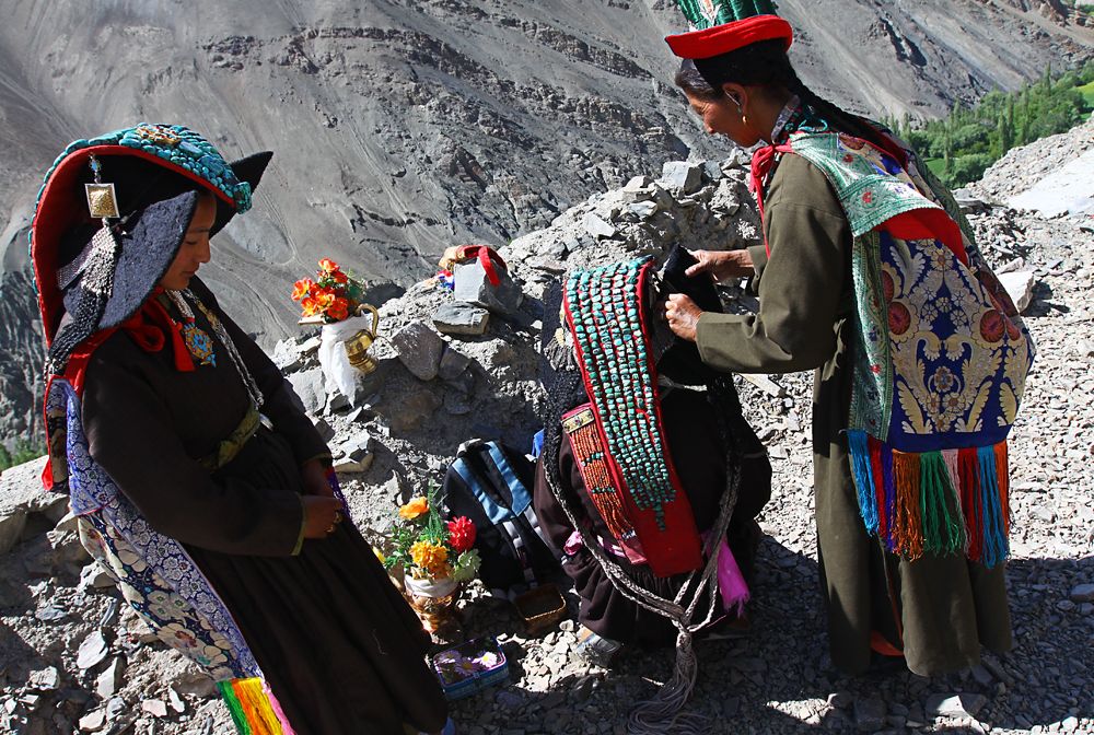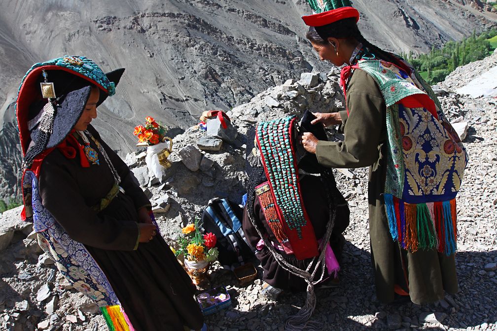 Ladakhi women prepare for Buddhist teachings near Temisgam monastery.