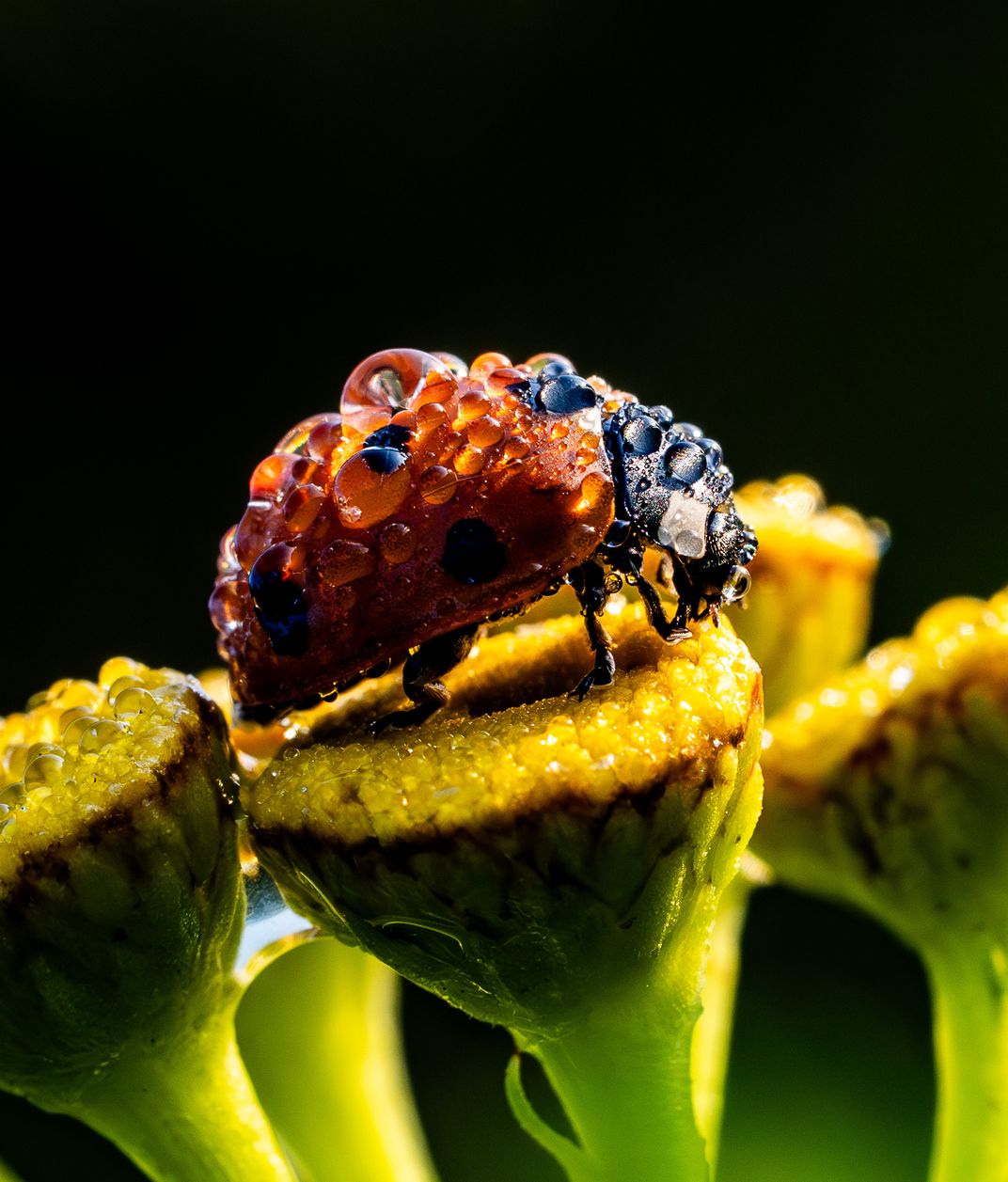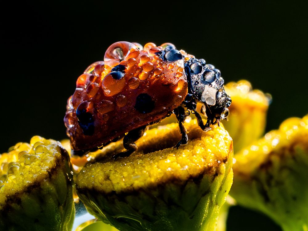 A dewy ladybird on a tansy flower. This ladybird just woke up from a rainy summer night, still covered in water drops.