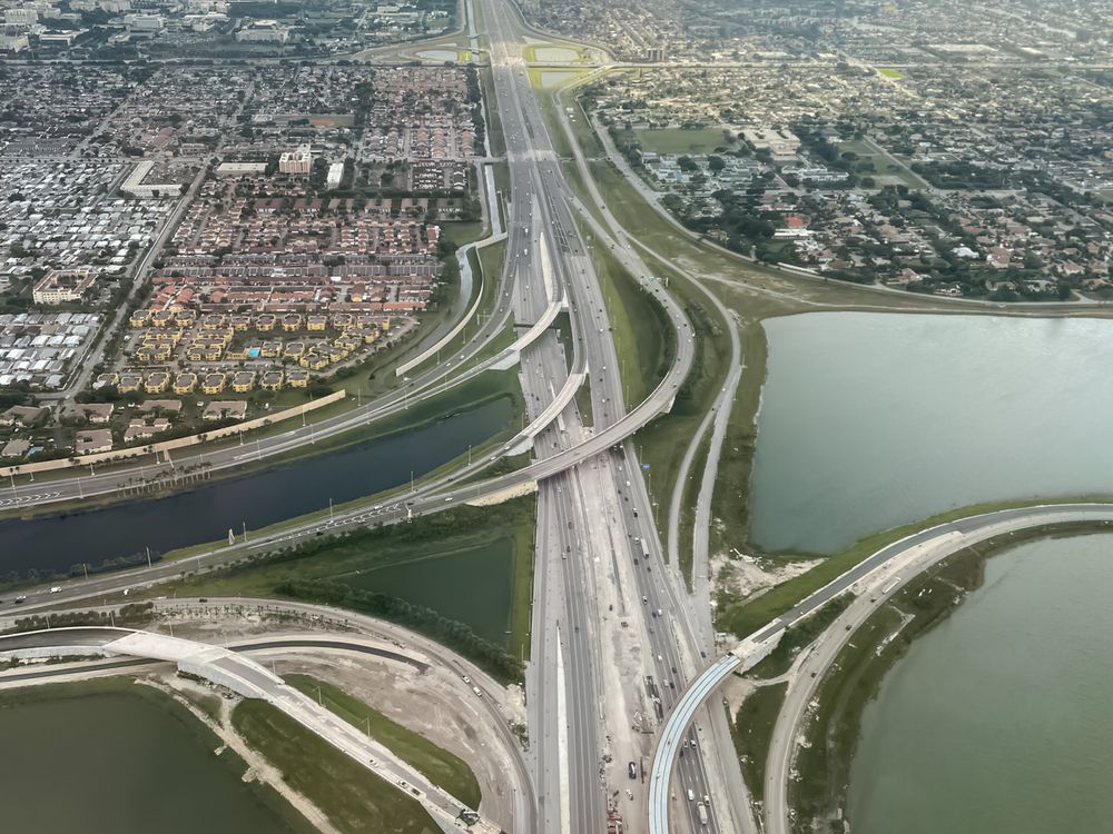 An aerial view of lakes and highways in the city of Miami. Taken from behind a plane window.