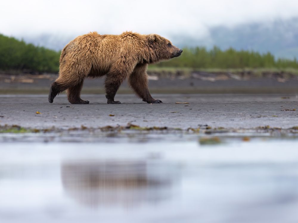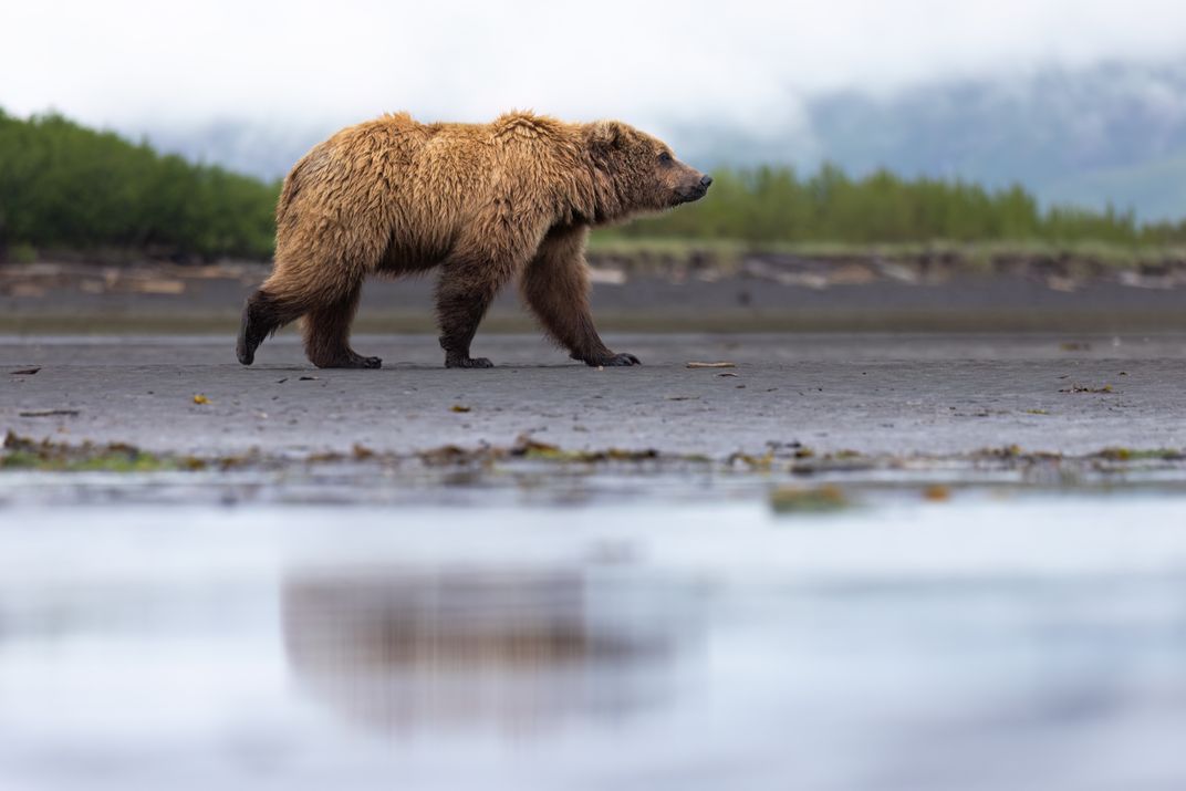 The parallel of grass above the bear and her reflection in the water below highlights the significance of coastal bears' relationship with the ocean and the life it provides. They graze on sedge when the tide is high and dig up clams when it is low.