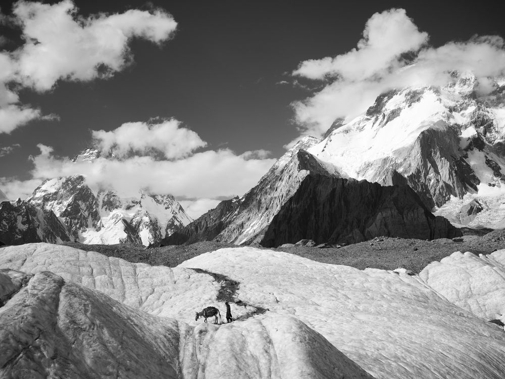 On the left side of K2 is the second highest peak on earth and the most dangerous mountain in the world, and on the right side is Broad Peak, the twelfth highest mountain in the world. In the center of the image, we see a porter with his donkey, who are responsible for loading the mountaineers in Qaraqorum mountain.
