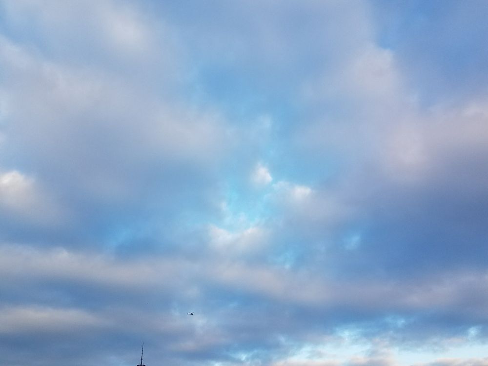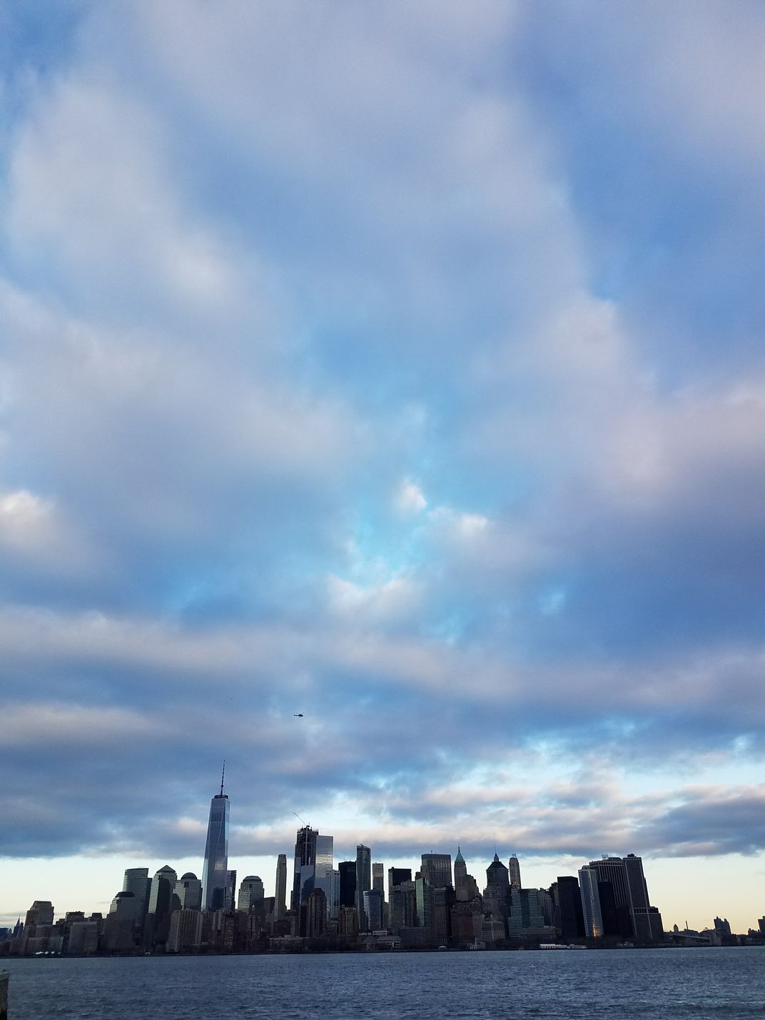 This is landscape of Manhattan, the sky full of cloud and there was a helicopter in the sky