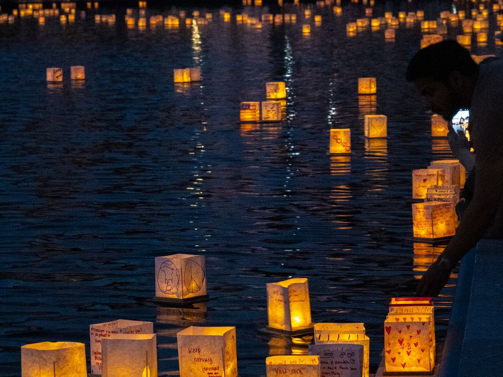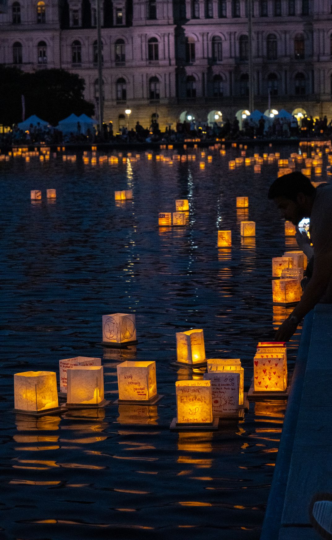 People are putting their lanterns in the reflecting pool to set their wishes and dreams afloat, with the state capital building in the background.