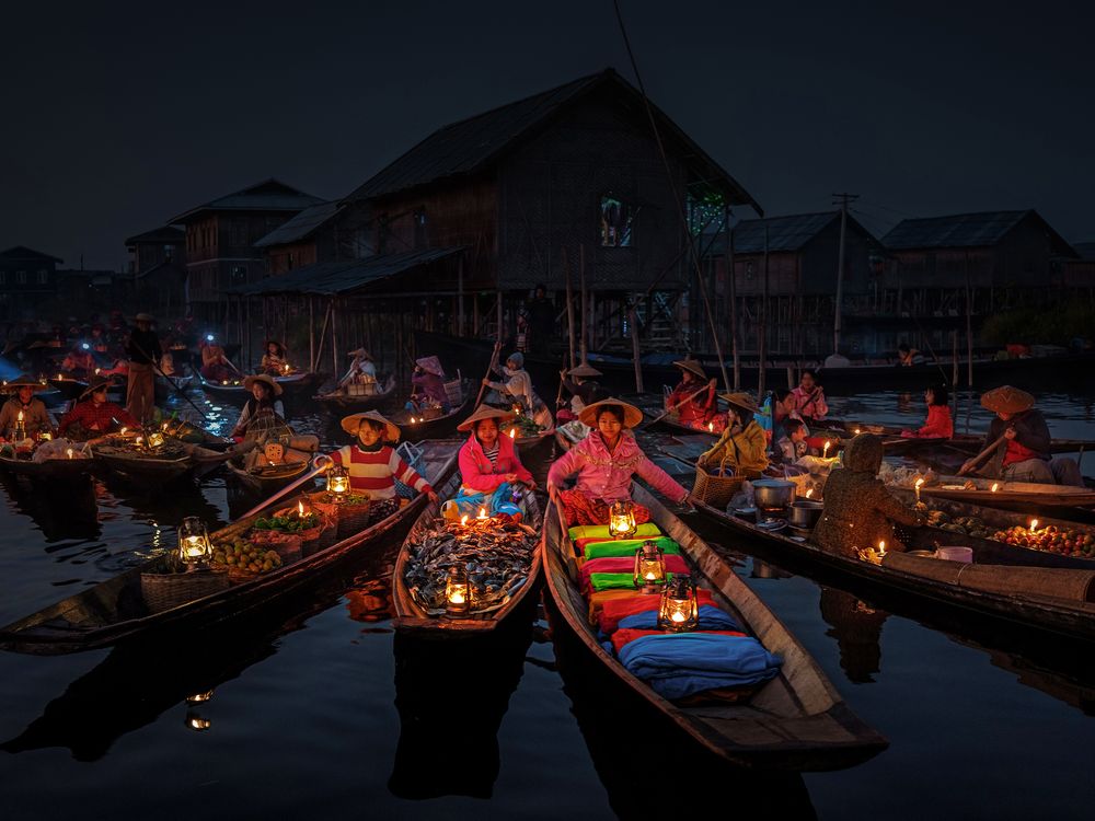 Vendors gather before dawn at Inle Lake’s floating market, their boats illuminated by lanterns as they trade produce, fish, and textiles. The warm glow of the lamps reveals the daily rhythm and resilience of life on Myanmar’s water villages.