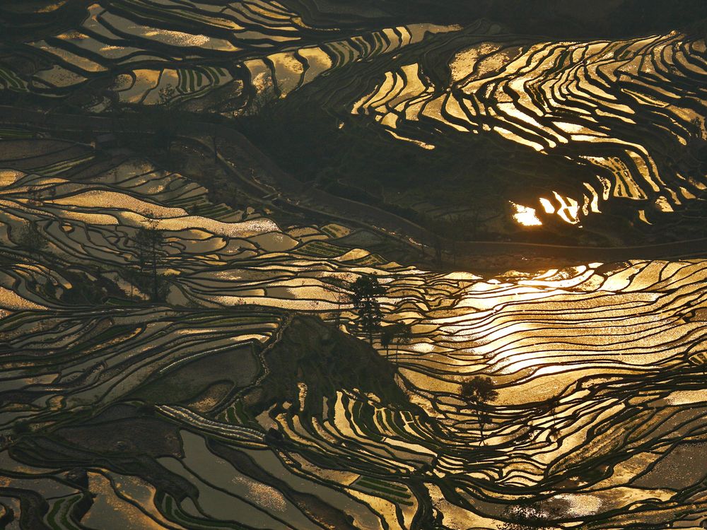 Terraced rice fields of Laohuzui at sunset. Yuanyang, Yunnan, China.