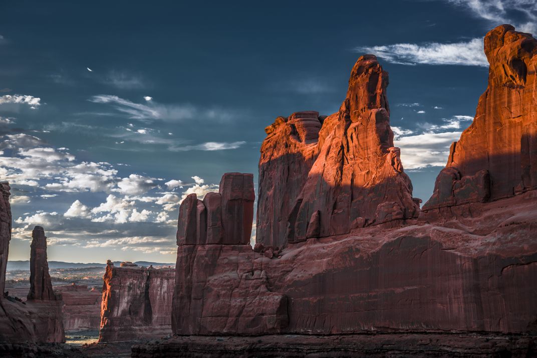 Late evening sunlight falling on the Courthouse Towers at Arches National Park, Utah.