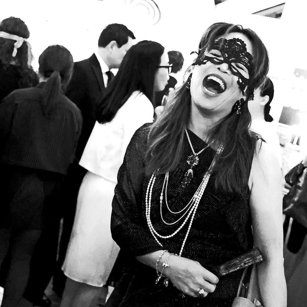 At a masquerade themed charity event, a pretty lady was laughing over a joke.