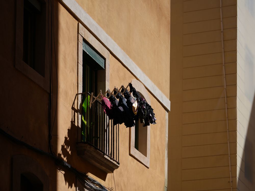 Clothes flutter on balconies while façades undergo restoration, creating a geometric dance of light and shadow in Barcelona’s historic streets.
