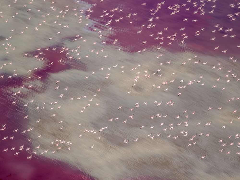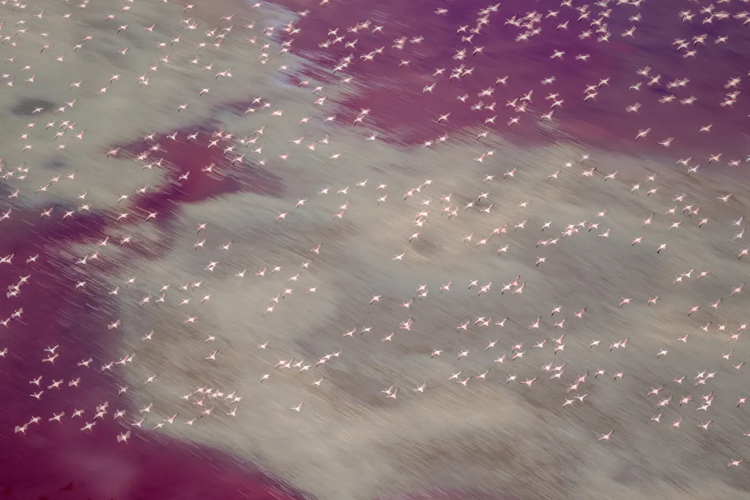 Photographed from a helicopter over Lake Magadi, this 1/15-second slow-shutter image blends motion with the lake’s extraordinary palette of purples and soft earth tones. While the background dissolves into gentle streaks of color, a flock of flamingos remains distinct enough to anchor the composition, creating a balance between abstraction and clarity.
