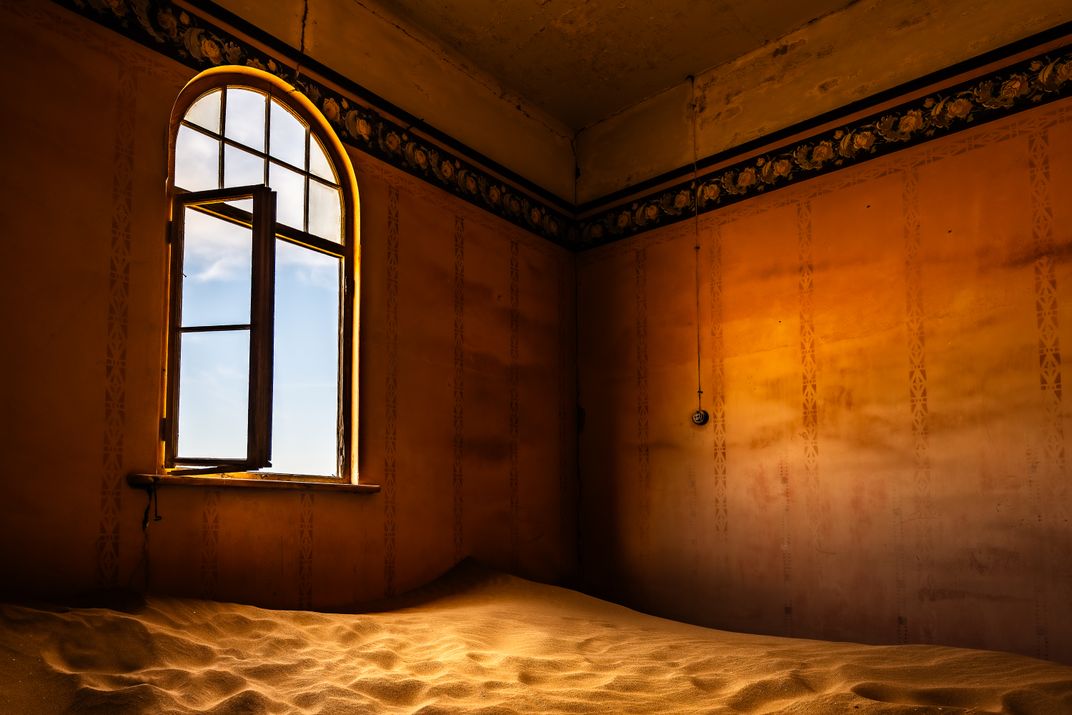 Sunlight streams through an arched window into a sand-filled room, its peeling walls and faded trim revealing the ghostly beauty of Kolmanskop, Namibia. Once a thriving diamond mining town in the Namib Desert, Kolmanskop was abandoned in 1956, leaving its grand buildings to slowly succumb to invasive dunes. Today, windblown sand carpets the interiors, transforming these remnants of luxury into surreal, haunting landscapes that powerfully evoke the passage of time and nature’s reclaiming force.