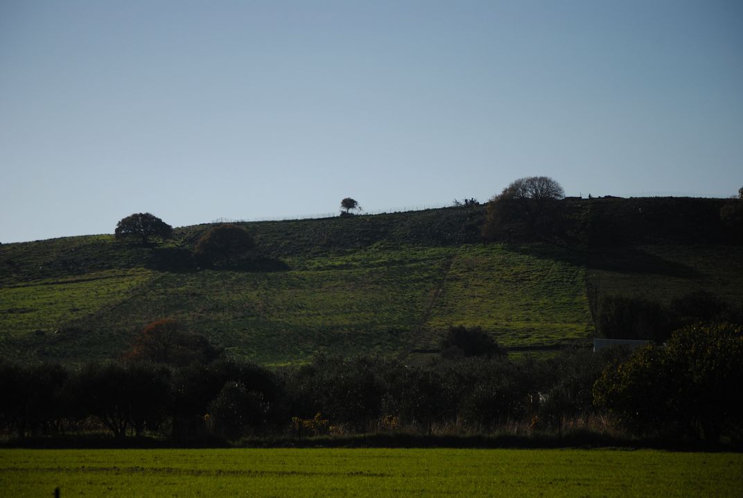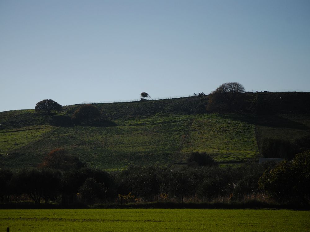 A hillside unfolds in gentle layers of green, illuminated by the sun. Lone trees stand along the ridge, their shadows stretching across the fields and creating subtle patterns in the landscape.