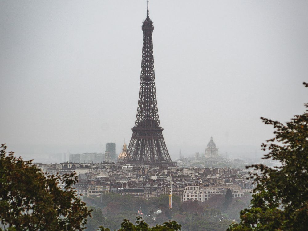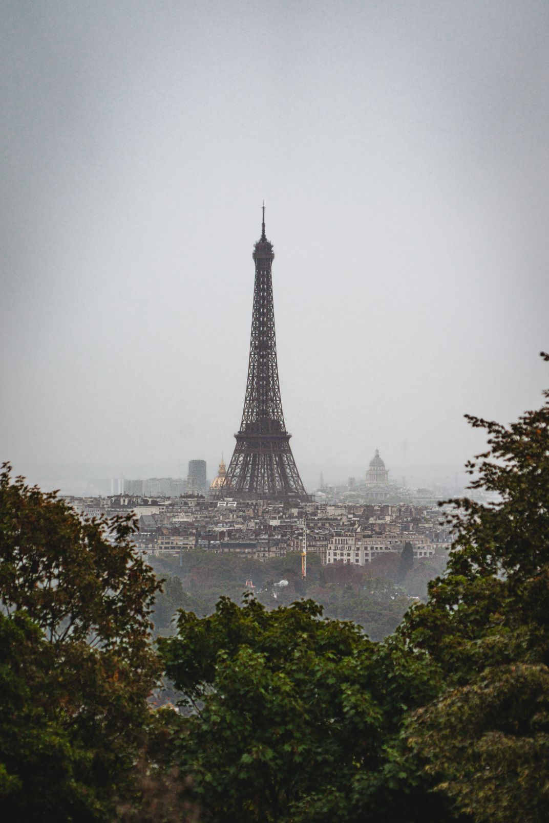 Vue depuis les hauteurs, la silhouette de la Tour Eiffel se dresse au loin, comme figée dans une brume de silence. Entre les feuillages, un rideau végétal s'entrouvre sur un Paris contemplatif, presque irréel. Dans cette atmosphère flottante, le temps semble suspendu. La ville palpite doucement à l’arrière-plan, comme un rêve qu’on n’ose pas troubler.