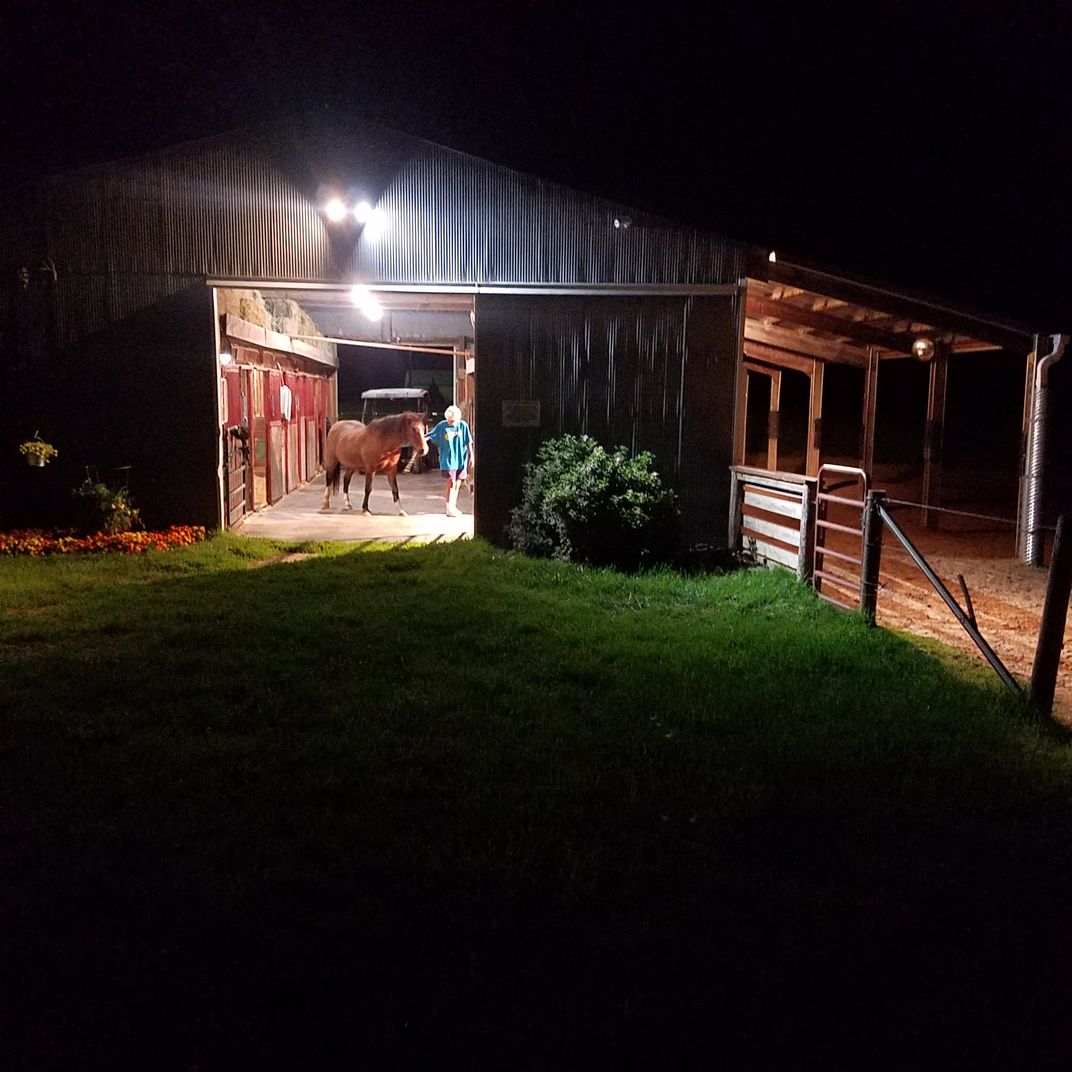 Last chore of the day. This is my mom taking out our 31 year old horse (Liberty) after giving her her last grain of the day. Liberty is the equivalent of 90 something in human years. Liberty doesn't have many teeth so lives off grain soaked in water. Liberty gets grain 5 times a day.