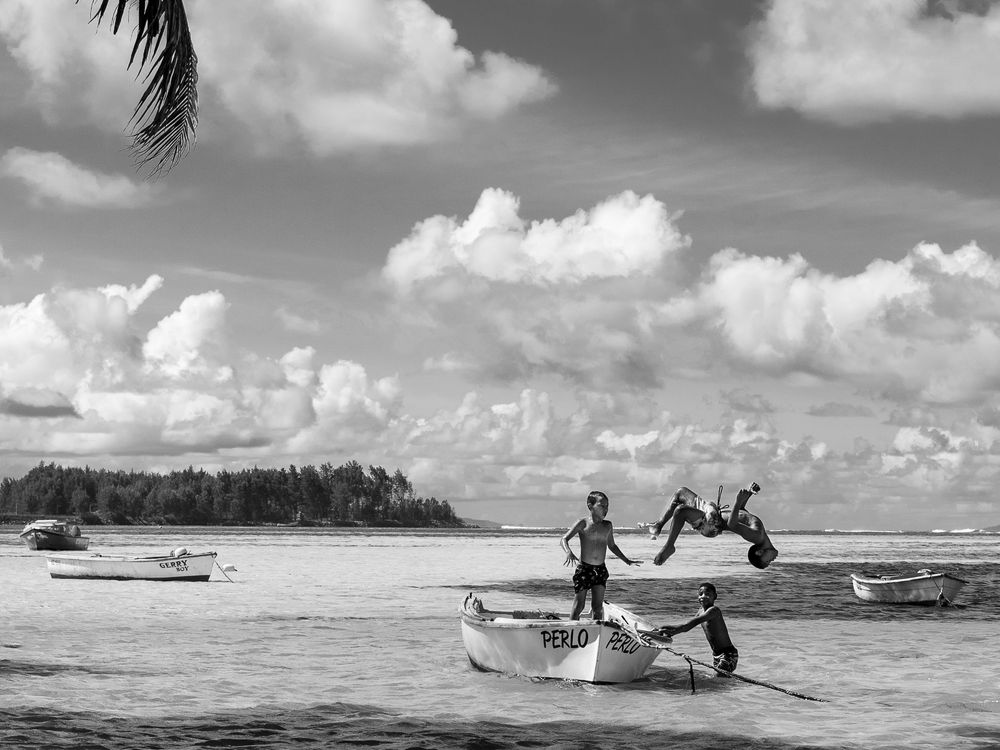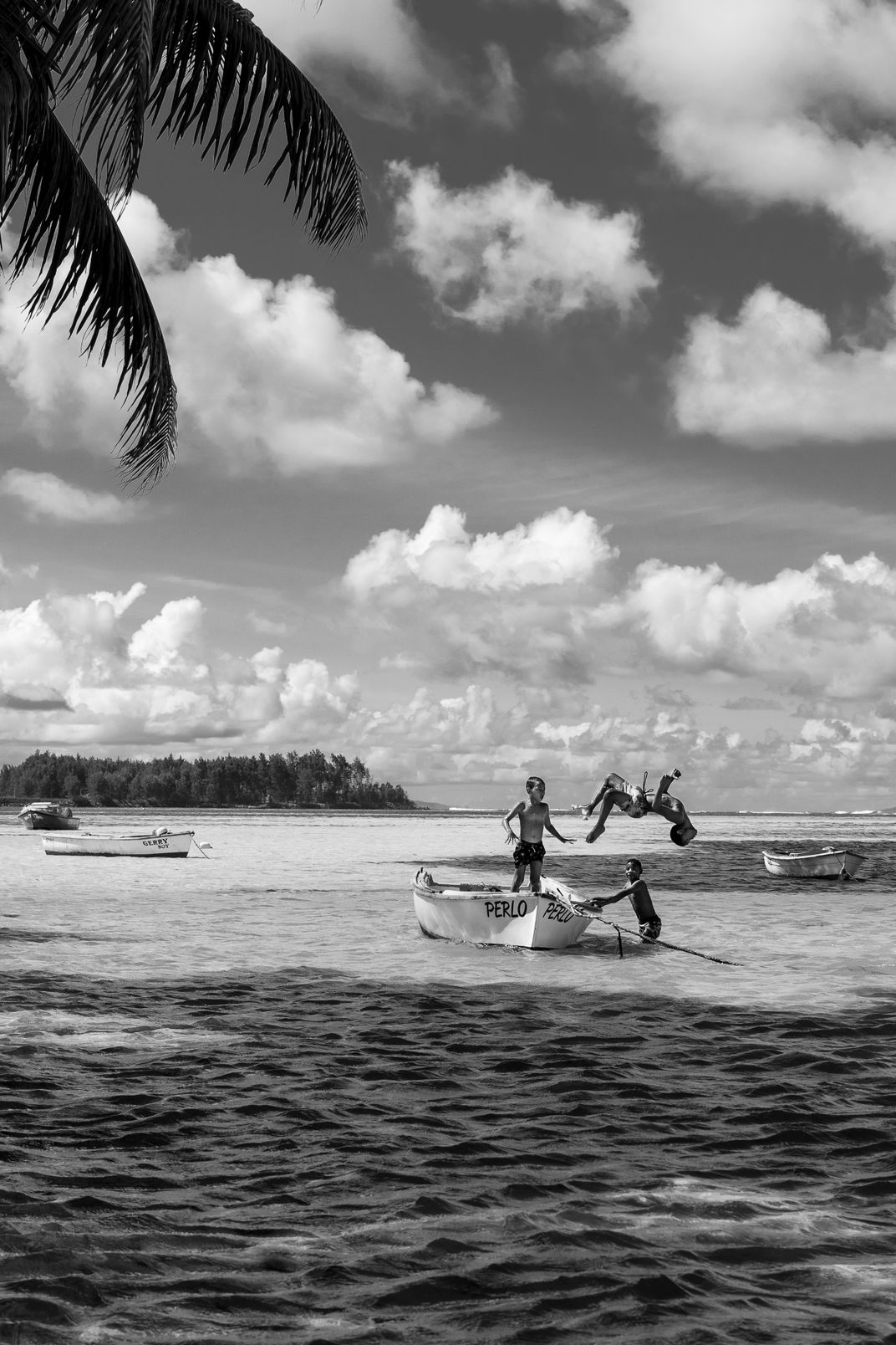 Children play on a small boat, one caught mid-air in a fearless flip. A fleeting summer moment of freedom over calm waters.
