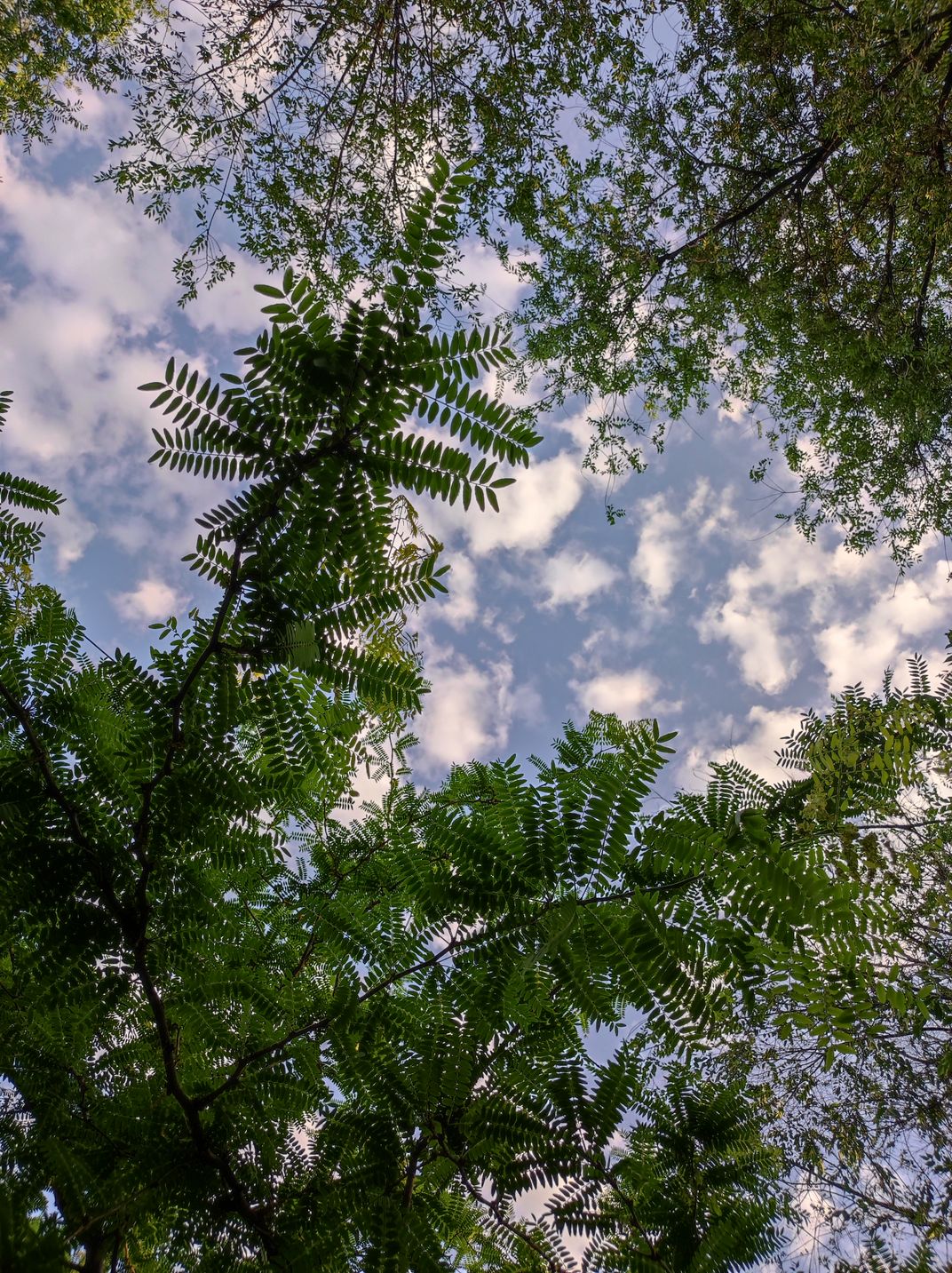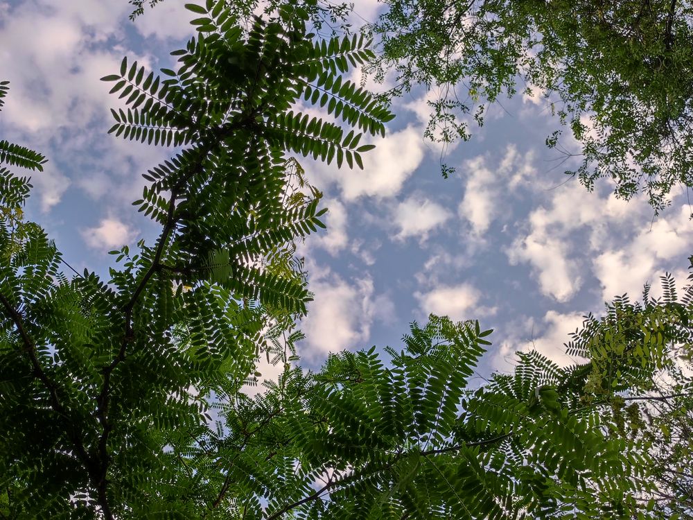As leaves sway in a tranquil dance beneath a canvas of cloud-kissed skies, nature's harmony unfolds, merging the elegance of foliage with the ever-shifting drama above.