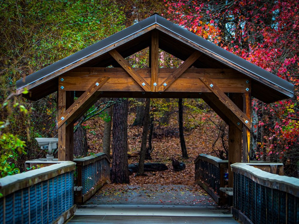 This photo shows a classic Americana subject: a bridge surrounded by fall leaves. But the leaves have only turned on one half of the bridge.