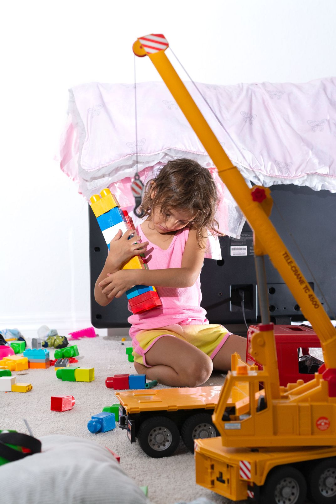 A young girl tenderly builds her lego house with the help of her toy cranes. She sits among a carpet full of legos as her posture is reminiscent of the Statue of Liberty.