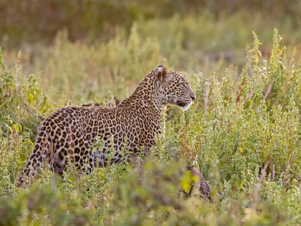 This is a female leopard moving through vegetation along a river in the Ol Kinyei Conservancy in the Maasai Mara just before sunset.