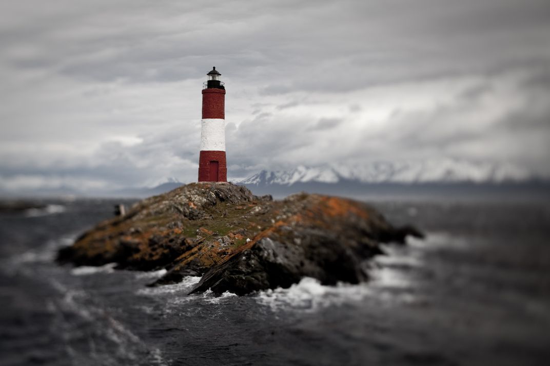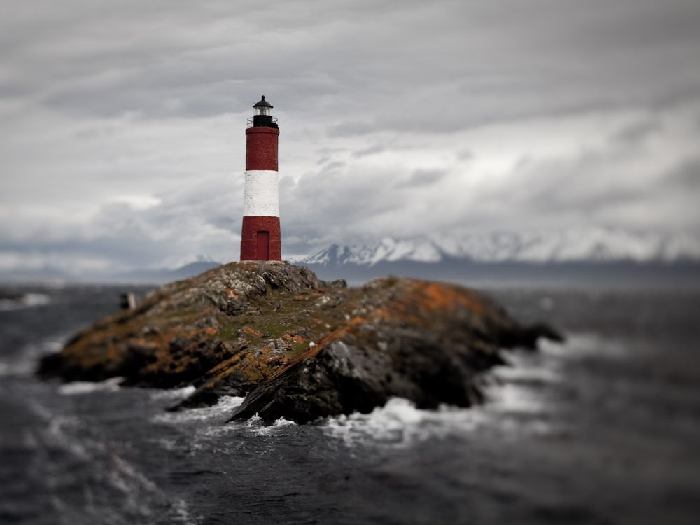 Les Eclaireurs Lighthouse, standing near Ushuaia in the Beagle Channel, Tierra del Fuego in Argentina. Taken with a (wet) tilt shift lens.