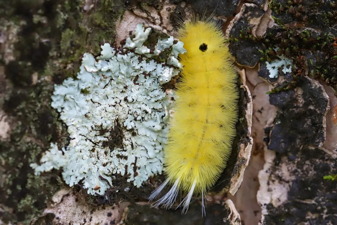 fiz esta fotografia no tronco de uma árvore onde pude captar esta taturana amarela entre alguns musgos e liquens