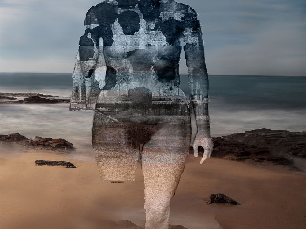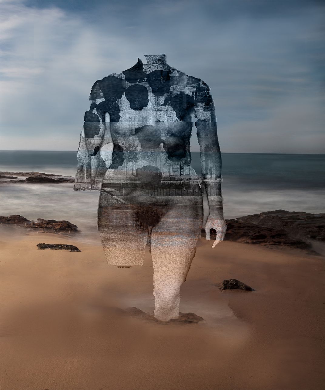 The picture depicts a narrative from my most recent body of work. I work with the idea of an alternate reality in an individual’s existence relating to what was and what is. The ephemeral quality in the narrative is what I am trying to achieve. Decay and dissolutions of what was once beautiful.The picture was captured at a Crystal Cove and The rocks were superimposed and licensed and bought. Sculpture Skies and sands is created by me.