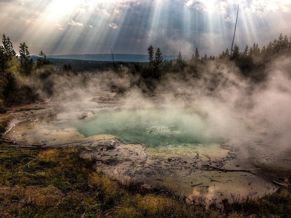 This was taken at the Emerald spring in the Norris Geyser Basin in Yellowstone Natioanl Park. It was nice overcast day, great day for a walk around the boardwalk. I saw the sun peaking through the clouds so I grabbed my camera and tried to see if the light rays would intensify. Slowly they did and it created a great background. The spring gave off an erie mist and the sun beams helped to light up parts of the mist creating a very mystical look which I liked. It was a very enjoyable shoot.