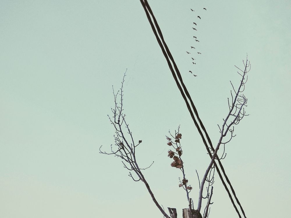 A tree with severed branches...a branch that has been severed grows back. Although the power line, which could symbolize limitations, is still there. Despite these limitations, the tree sprouts again and lets the birds of its imagination fly. The image represents growth despite limitations.