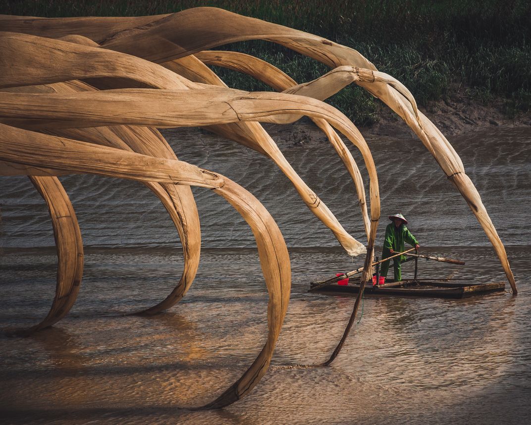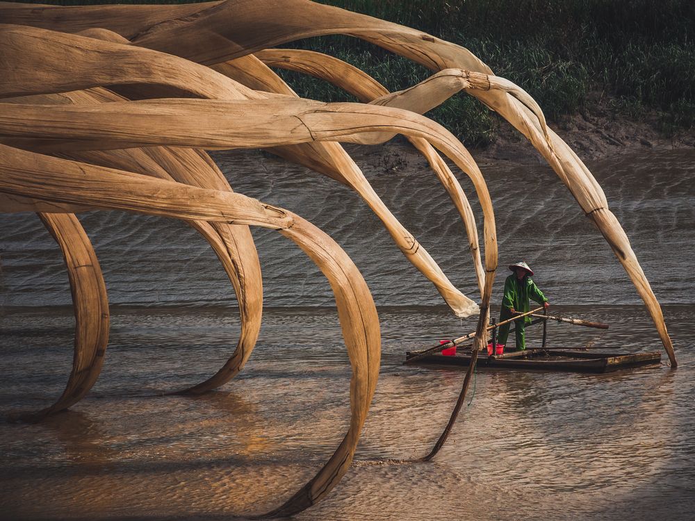 Seemingly a tentacled sea creature attempting to devour a boatman, it is really just a Chinese fisherman setting out nets in the river.