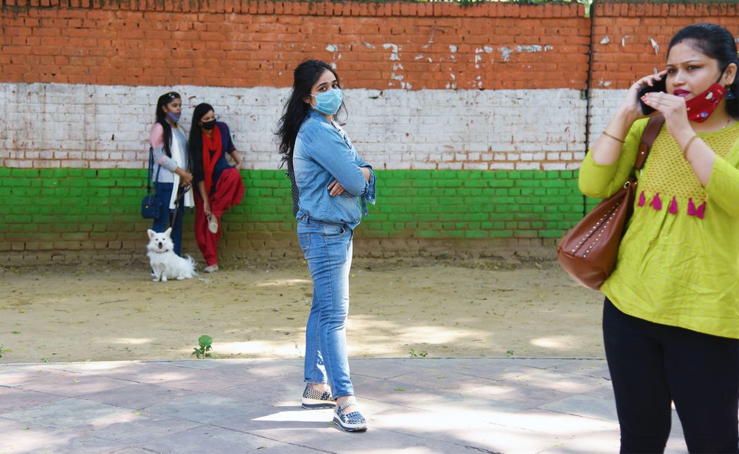 Girls waiting on a street in New Delhi as the lockdown restrictions are eased. Photo by Sondeep Shankar