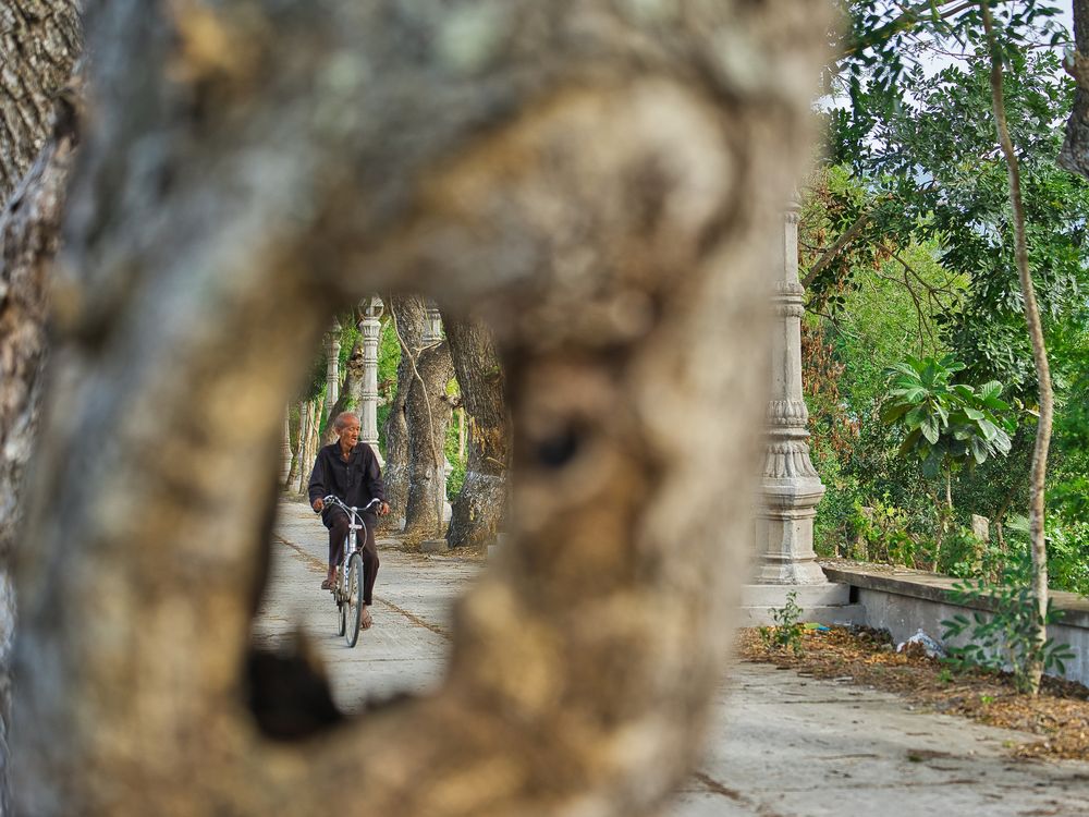 Life around Chùa Krăng Krốch (Chùa Hàng Cồng - Pagoda) in An Hòa village, Tri Tôn, An Giang province. The photo was taken through a tree trunk.