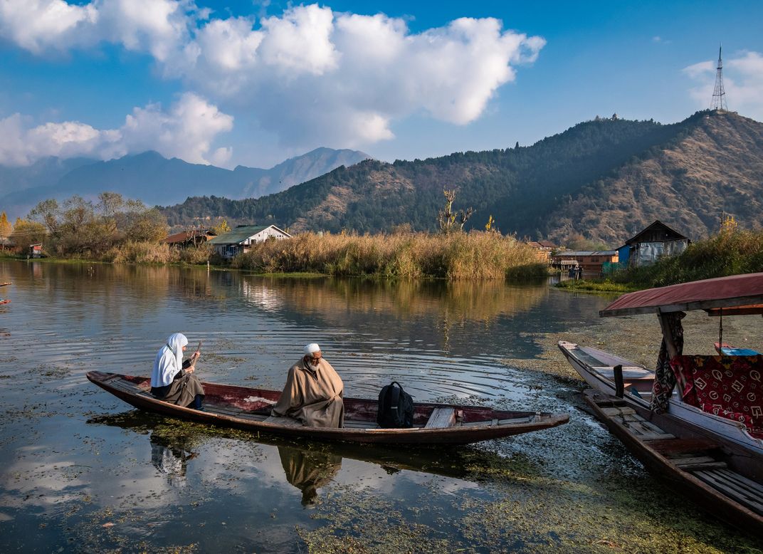 An old man is taking his granddaughter from school at afternoon by boat on Dal lake, Srinagar.