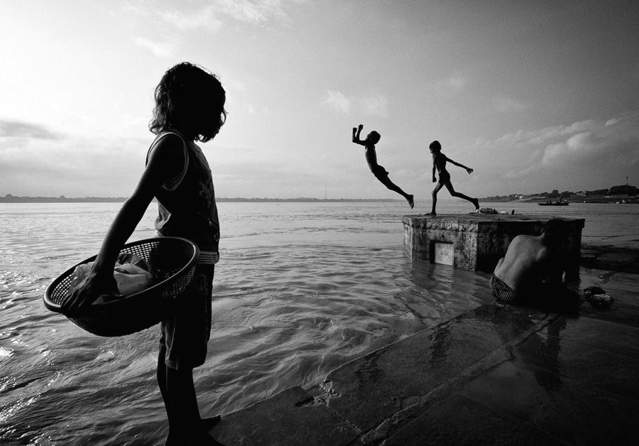 Life at Ghats This picture taken at Varanasi depicts human emotions at its best where a working kid is a flower seller selling flowers at the ghat and must be wondering on her fortune why she cant able to play like others of the same age.