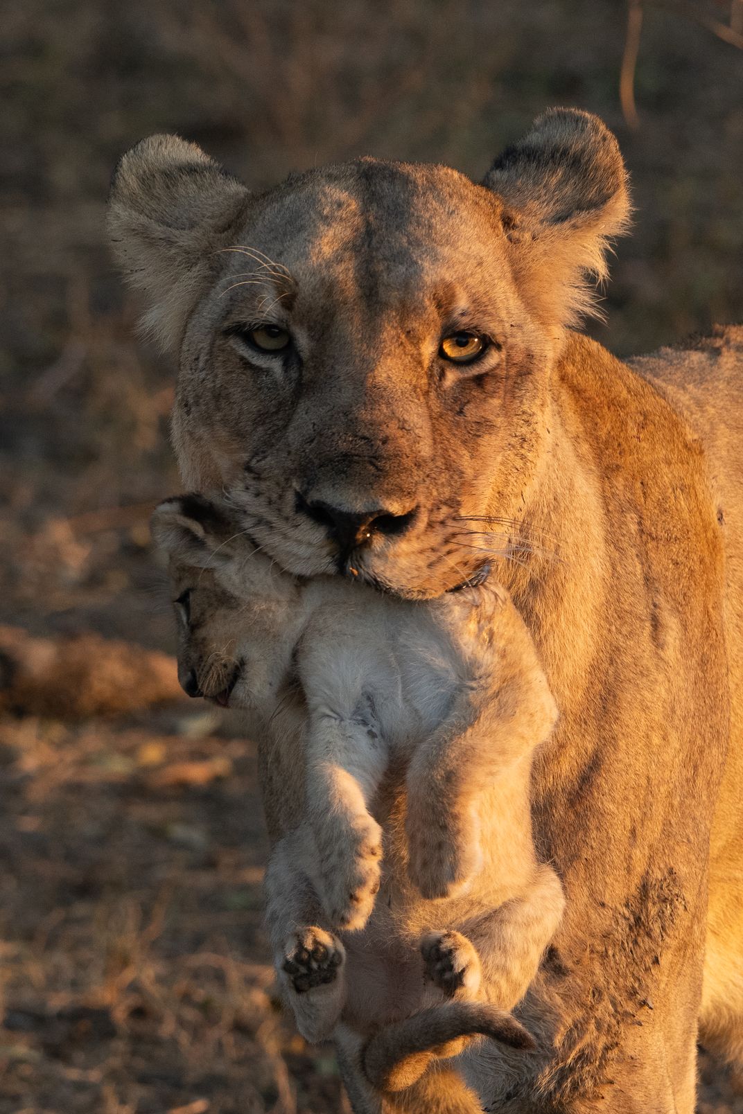 One lioness locked eyes with us for a moment, her expression a mix of resolve and tenderness as she cradled her cub. In that brief encounter, you could feel the weight of her responsibility and the fierce devotion driving her across the golden morning light. It was a rare, intimate glimpse into the quiet courage required to raise new life in the wild.