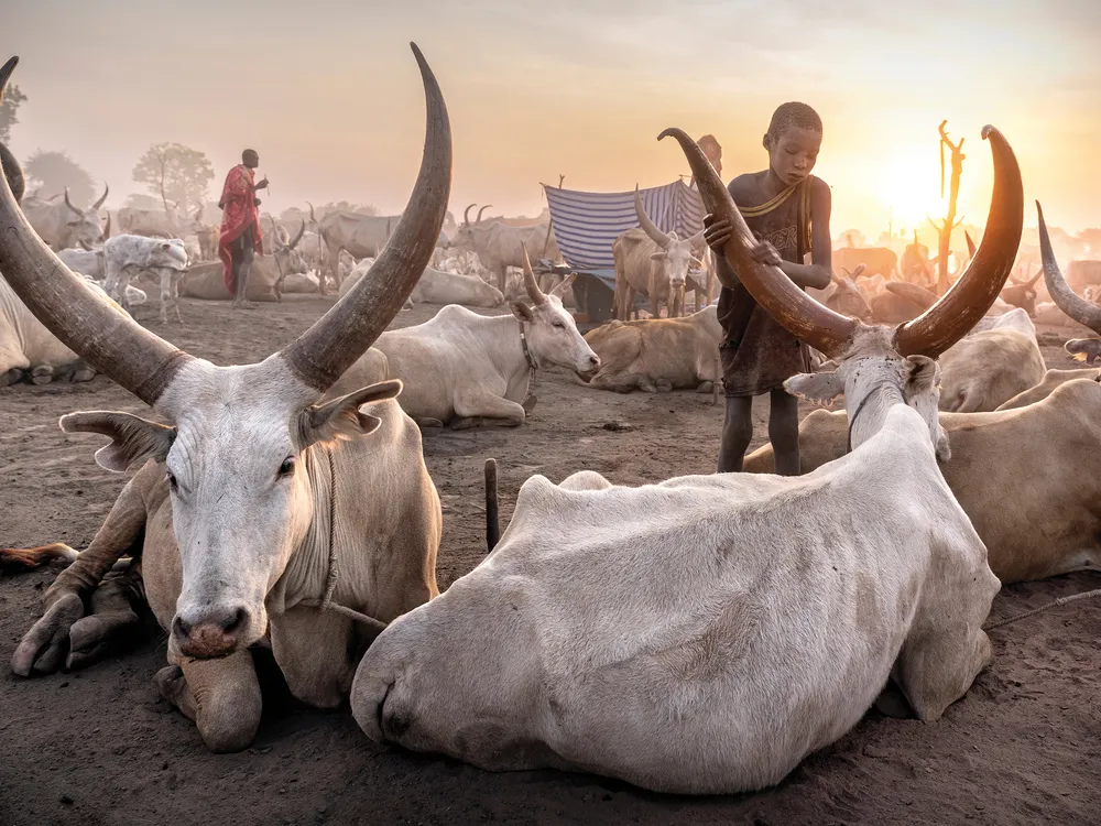 A Mundari child cleans the horns of a bull with a mixture of mud and water in South Sudan. The Mundari are cattle herders who live symbiotically with their Ankole-Watusi cattle, characterized by their large horns.