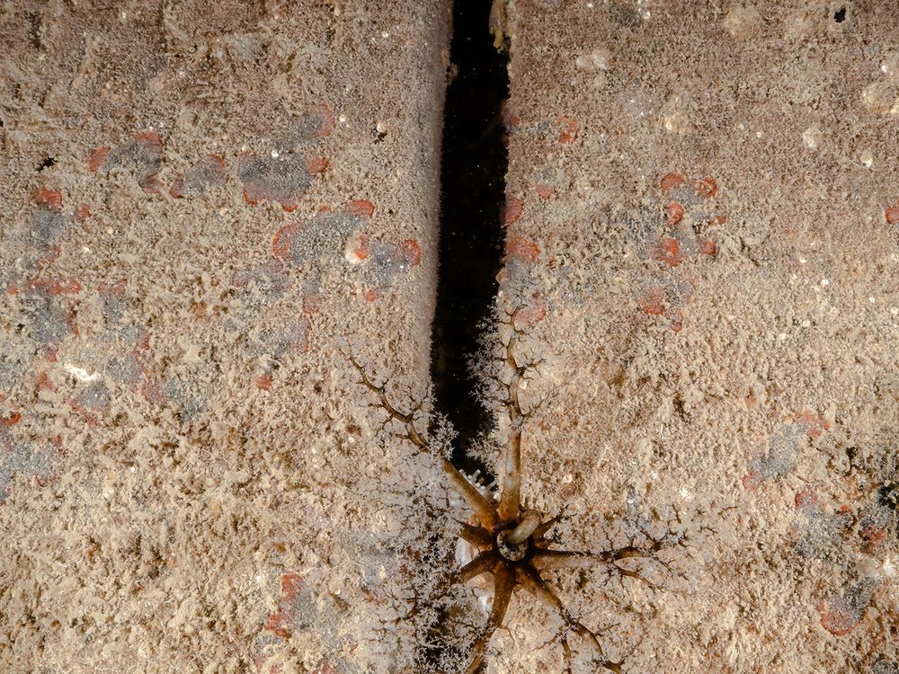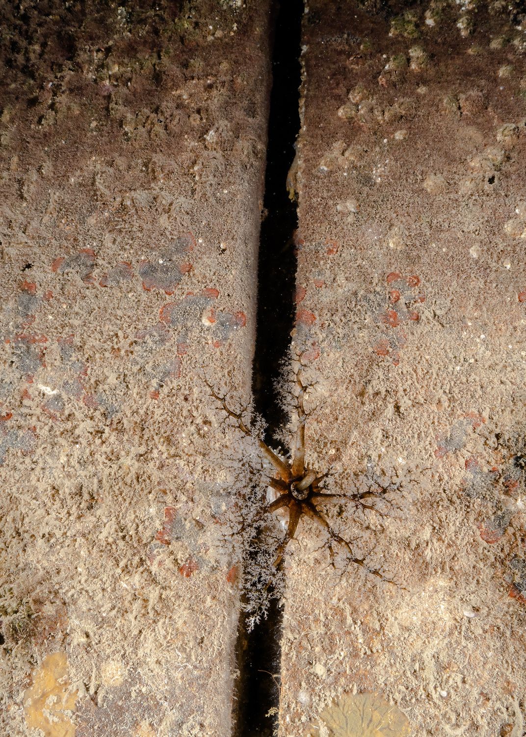 Living in between two cast concrete slabs that make up the walls of a sea overflow storm drain that travels under a busy road in Dorset we have a small sea gherkin. In our local location this is the only place where I find an abundance of these echinoderms living in almost every join and crack, feeding on the passing detritus and the tide washes through the storm drain twice a day. For me this image portrays a real positive story regarding our interaction with the environment as we have inadvertantly created the perfect conditions for this species to thrive. I love how the concrete walls feel like a painting, when you examine them closely they are covered in a large variety of species encrusting them and the reflection of my strobe onto the detritus particles in the crack makes it feel almost space like , a universe beyond ours.