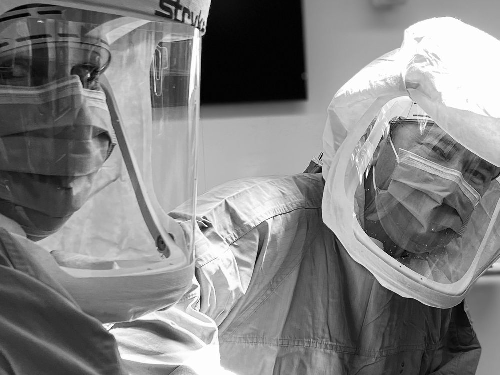 A day in the life of the people who work in the operating room. This picture is of an orthopaedic surgeon and his physician assistant during a procedure. You can see the smiles under their masks. Working in an OR, is truly one of those jobs that you should love what you do, or not be there. The hoods, they are also sterile and provide protection for the scrub team and well as the patient.