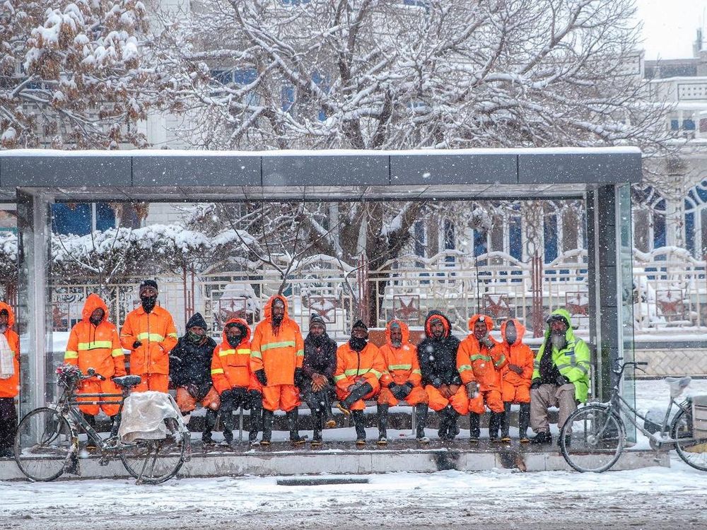 On a cold winter morning, city workers clear snow from the streets. Their bright orange uniforms bring warmth and color to the silent, white landscape, showing how life and duty continue even in the harshest weather.