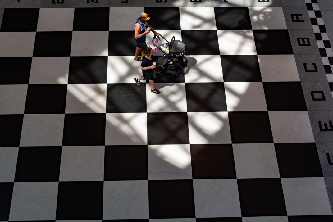 In a Poznań shopping mall, a couple with a stroller walks across a giant floor chessboard, moving through patches of light and shadow as if everyday family life were just another move in a much larger game.