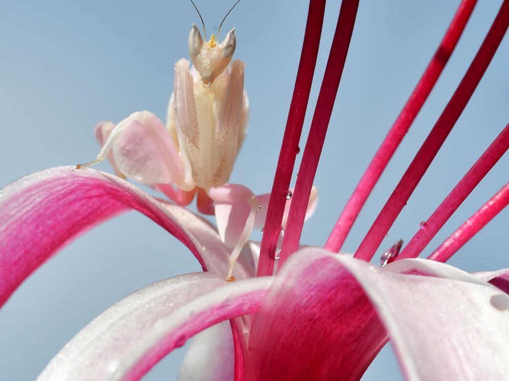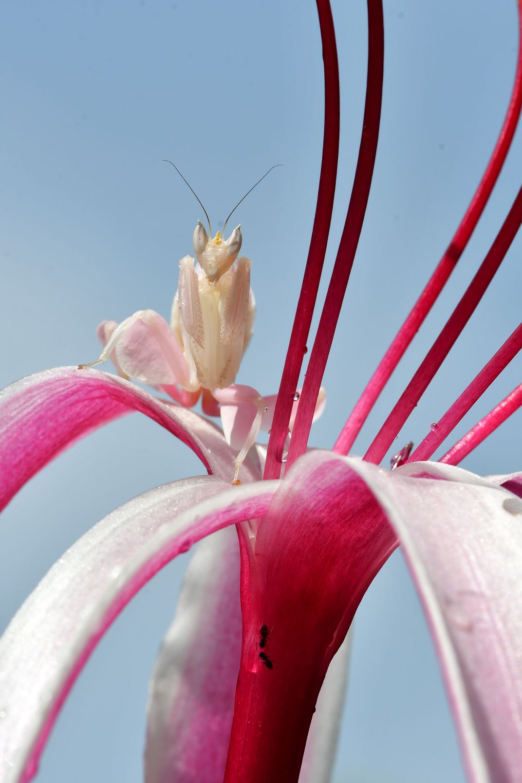 The limbs of the orchid mantis evolved a structure and color similar to petals. The orchid mantis has the most perfect camouflage, and can adjust its body color according to the depth of the pattern. The orchid mantis mimics itself in the orchid without being detected by its prey. It is ready to prey on ants under orchids.