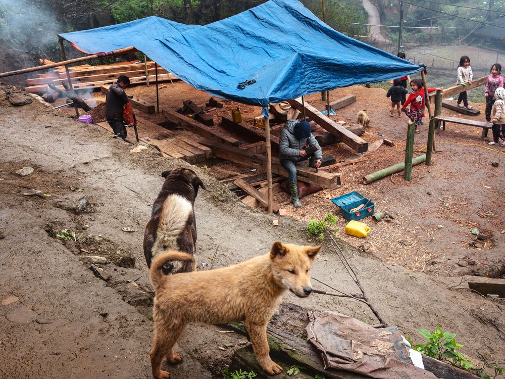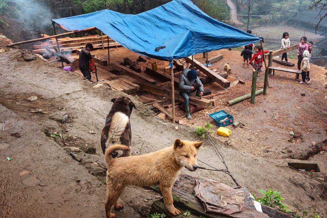 On a misty morning in Sapa, daily life unfolds under a blue tarp shelter where villagers work with timber as children play nearby. Dogs wander freely across the muddy hillside, capturing the rhythm and resilience of mountain village life.